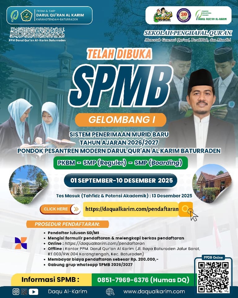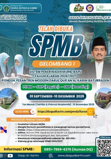 Mari bergabung bersama kami di Pondok Pesantren Modern Darul Qur'an Al Karim Baturraden dan mulailah hafalan Al-Quran Anda. Kami yakin, Anda memiliki potensi besar untuk menjadi hafiz dan hafizah yang akan berkontribusi bagi umat dan bangsa.