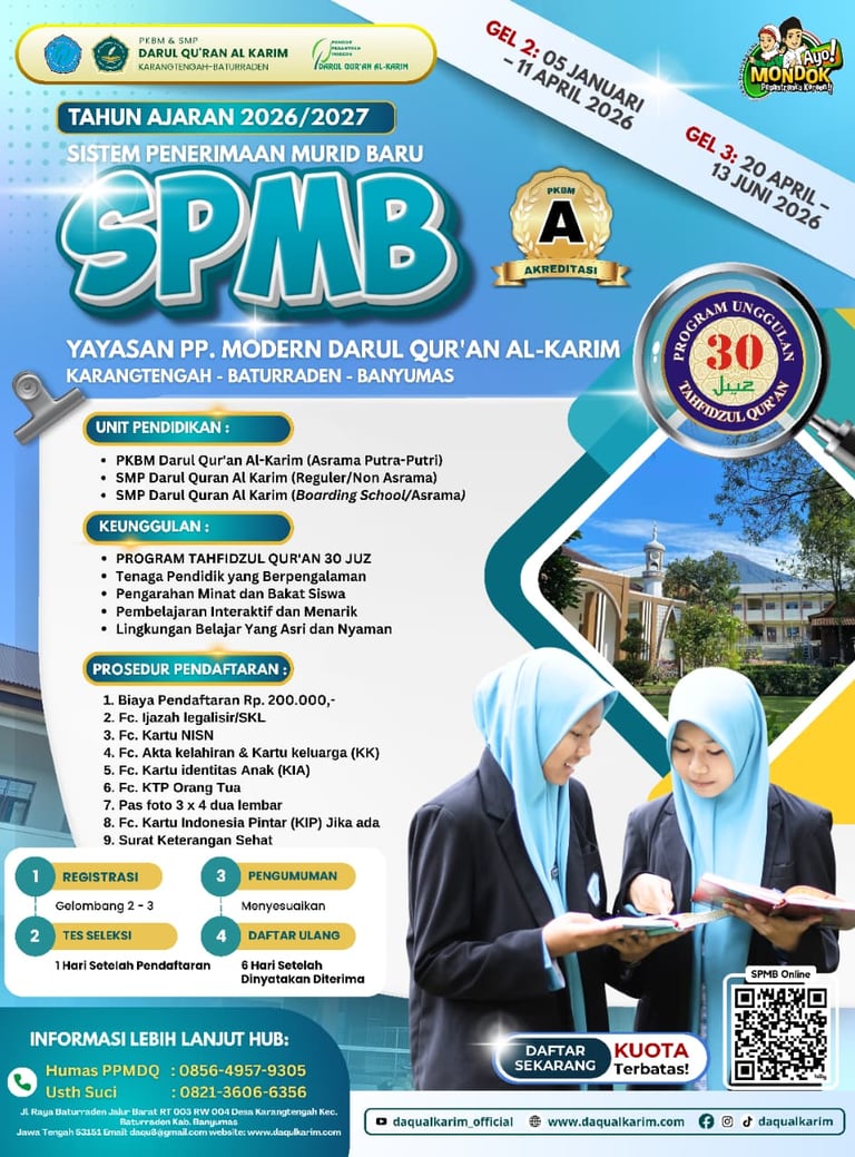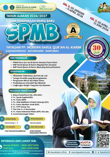 Mari bergabung bersama kami di Pondok Pesantren Modern Darul Qur'an Al Karim Baturraden dan mulailah hafalan Al-Quran Anda. Kami yakin, Anda memiliki potensi besar untuk menjadi hafiz dan hafizah yang akan berkontribusi bagi umat dan bangsa.